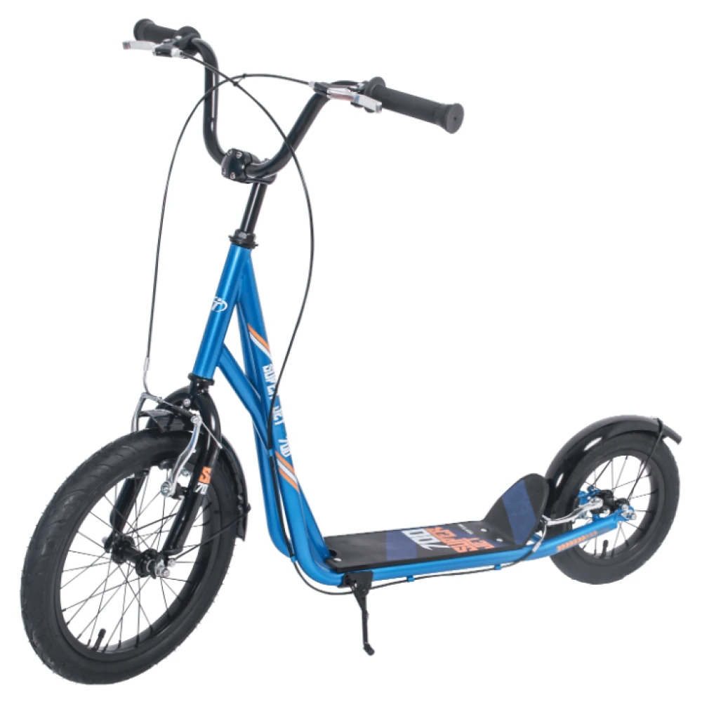 Самокат, изготовленный в синих цветовых оттенках привлекает техническими особенностями. Большие надувные колеса, регулируемая обновленная рулевая система легко справляется с неровностями. По этим причинам производитель допускает езду по городской и сельской местности.